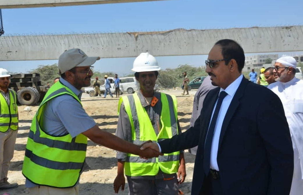 المحافظ خلال زيارته رفقة المختصين بالمحافظة لموقع جسر غرير الواقع بوادي غرير غرب المكلا اطلع على أعمال إنجاز الجسر التي تتم بنظام الصب المسبق والتي بلغت نسبتها 43%.