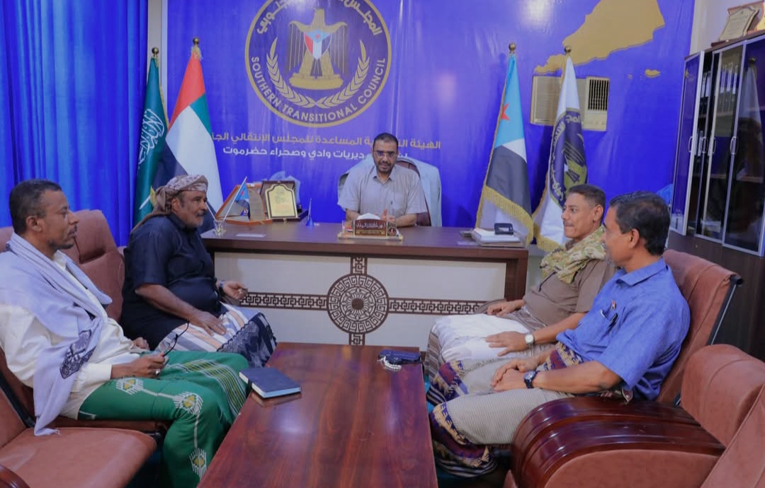 التقى رئيس الهيئة التنفيذية المساعدة للمجلس الانتقالي الجنوبي لشؤون مديريات وادي وصحراء حضرموت، محمد عبدالملك الزبيدي، اليوم الثلاثاء، رئيس لجنة التعليم العام في الجمعية الوطنية للمجلس، الأستاذ زيد عائض بن حريز.