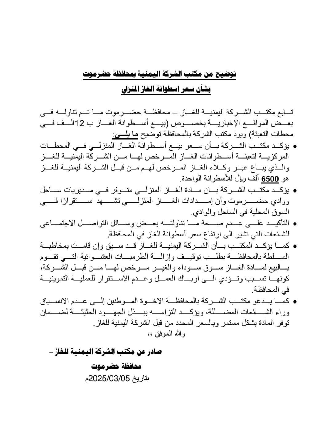 أصدرت مكتب شركة الغاز اليمنية بحضرموت بيان توضيحي فندت خلاله الشائعات والمعلومات المضللة التي نُشرت مؤخرا حول ارتفاع أسعار أسطوانة الغاز المنزلي بالمحافظة.