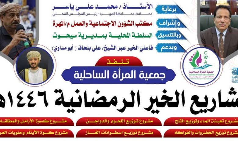من جانبها، عبّرت رئيسة جمعية المرأة الساحلية الأستاذة أوسان عقيل باعباد، عن امتنانها لكل الداعمين والمساهمين، وفي مقدمتهم محافظ المهرة الأستاذ محمد علي ياسر، والقائم بأعمال مدير عام مديرية سيحوت الشيخ محمد أحمد سعيد الزويدي، والشيخ علي بلحاف، وجميع فاعلي الخير، مؤكدةً أن هذه المشاريع تعكس روح التكافل الاجتماعي، وتساهم في تخفيف معاناة الأسر المحتاجة خلال الشهر الفضيل.