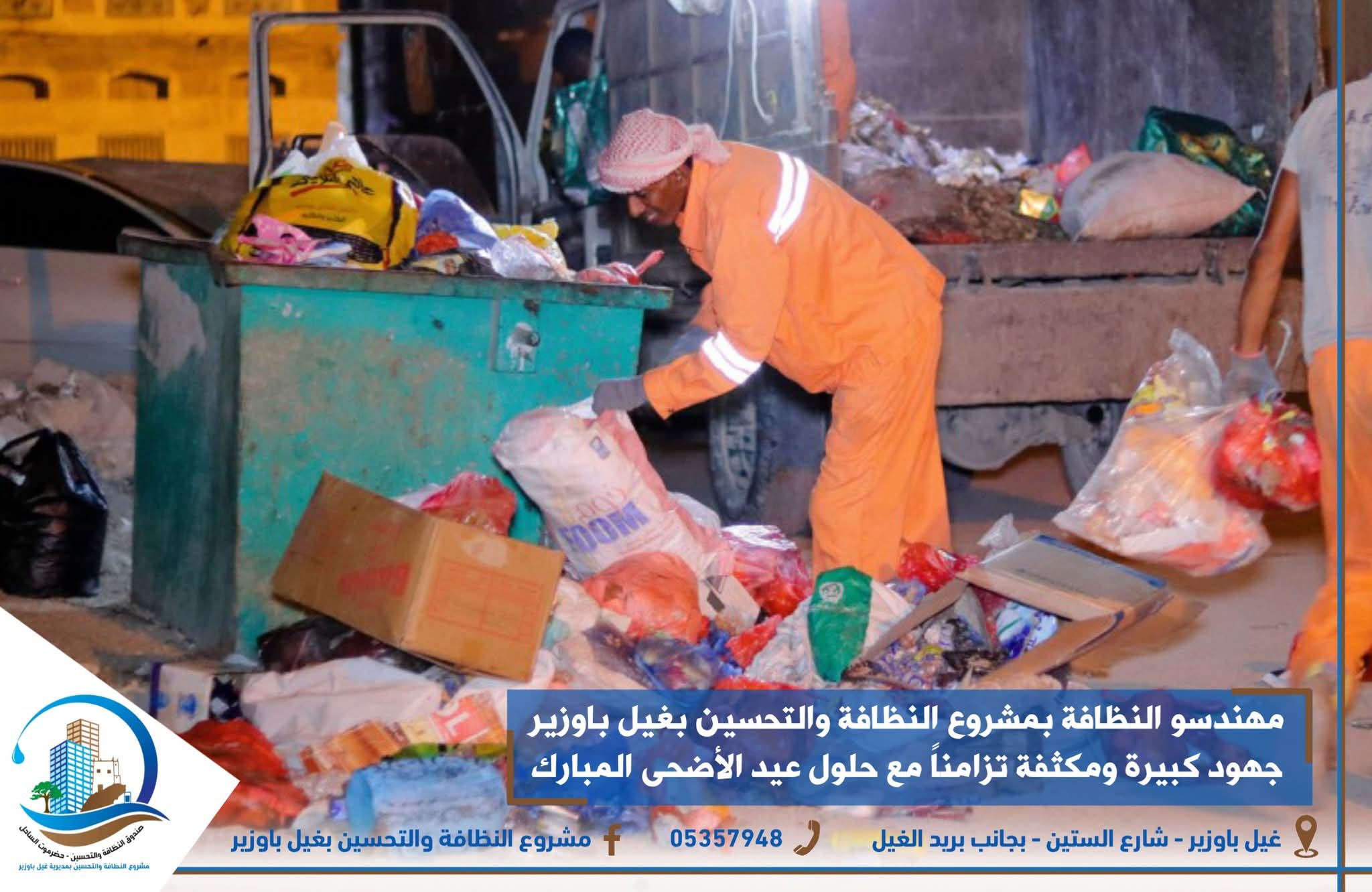 رفع مهندسو النظافة بمشروع النظافة والتحسين بمديرية غيل باوزير وتيرة أعمال النظافة بزيادة ساعات العمل وذلك بشأن رفع المخلفات من على الشوارع والأحياء السكنية ومواقع وضع القمامة المحددة بما في ذلك مخلفات الذبائح بالإضافة إلى أعمال الكنس وإزالة الأتربة على الشوارع، تزامناً مع حلول عيد الأضحى المبارك.
