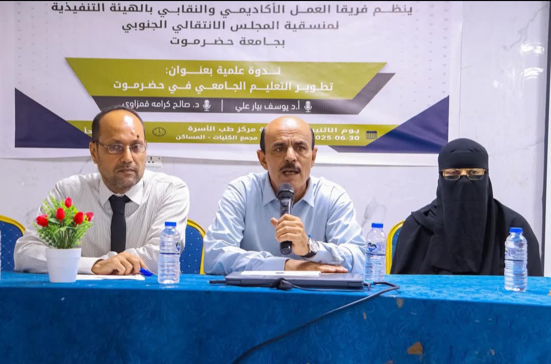 نظّم فريقا العمل الأكاديمي والنقابي بمنسقية المجلس الانتقالي الجنوبي بجامعة حضرموت، صباح اليوم بمدينة المكلا، ندوة علمية تحت عنوان “تطوير التعليم الجامعي في حضرموت”، وذلك في سياق الجهود المستمرة للنهوض بالقطاع الأكاديمي وتفعيل دوره في بناء الدولة الجنوبية المنشودة.
