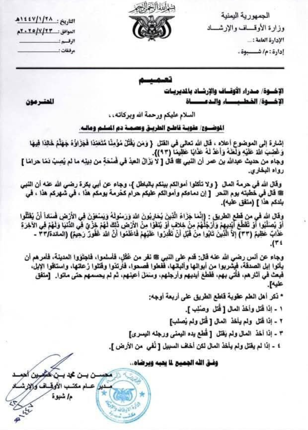 أصدر مكتب الأوقاف والإرشاد بمحافظة شبوة” تعميمًا رسميًا وجهه إلى مدراء مكاتب الأوقاف في المديريات، وخطباء المساجد والدعاة، يدعوهم فيه إلى تخصيص خطبة الجمعة القادمة للحديث عن حرمة دم المسلم وخطورة جريمة القتل وقطع الطريق، باعتبارها ظواهر دخيلة تهدد أمن وسكينة المجتمع.