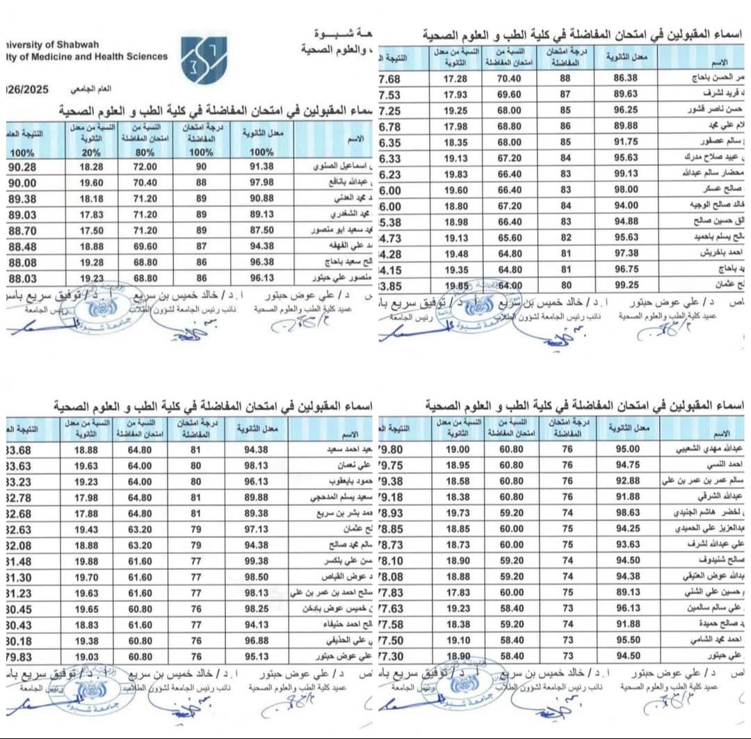 أعلنت جامعة شبوة” عن أسماء الطلبة المقبولين في كلية الطب والعلوم الصحية للدفعة الخامسة (نظام عام) للعام الجامعي 2025/2026م، وذلك وفقًا للملف المرفق مع الإعلان.