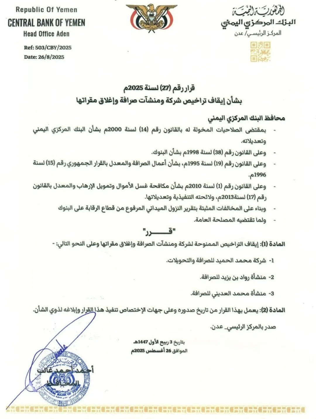 أصدر محافظ البنك المركزي أ. أحمد أحمد غالب قرار رقم (27) لعام 2025م، بشأن إيقاف التراخيص الممنوحة لشركة ومنشآت للصرافة المخالفة وإغلاق مقراتها، والمثبتة بتقرير النزول الميداني المرفوع من قطاع الرقابة على البنوك.