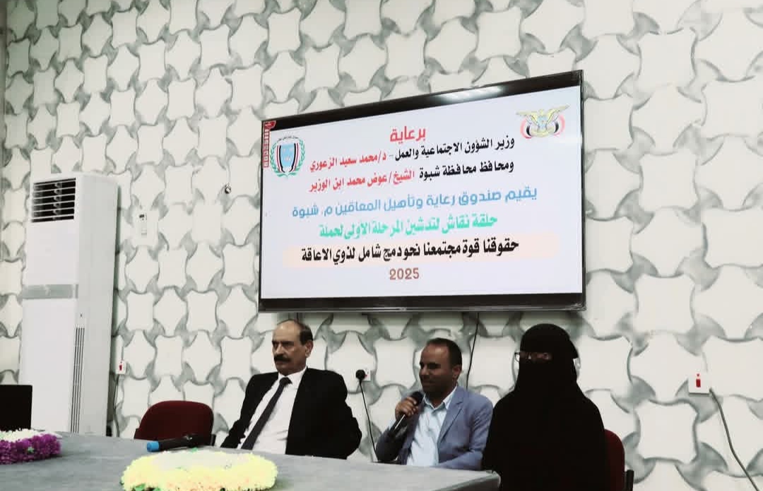 برعاية وزير الشؤون الاجتماعية والعمل، الدكتور محمد سعيد الزعوري” ومحافظ محافظة شبوة، الشيخ عوض محمد ابن الوزير” أطلق صندوق رعاية وتأهيل المعاقين بمحافظة شبوة صباح اليوم المرحلة الأولى من حملته التوعوية المجتمعية في قاعة الفقيد عبدالكريم الحامد، تحت شعار: “حقوقنا قوة مجتمعنا.. نحو دمج شامل لذوي الإعاقة 2025”.