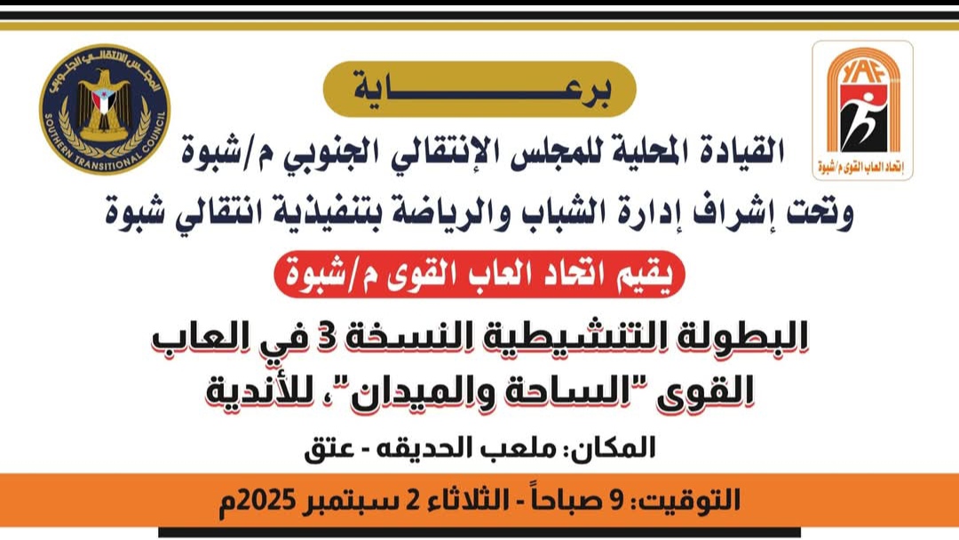 تنطلق صباح غداً الثلاثاء على أرضية ملعب الحديقة بمدينة عتق بطولة المحافظة التنشيطية الثالثة للأندية في العاب القوى، التي تقام برعاية القيادة المحلية للمجلس الانتقالي الجنوبي بمحافظة شبوة.