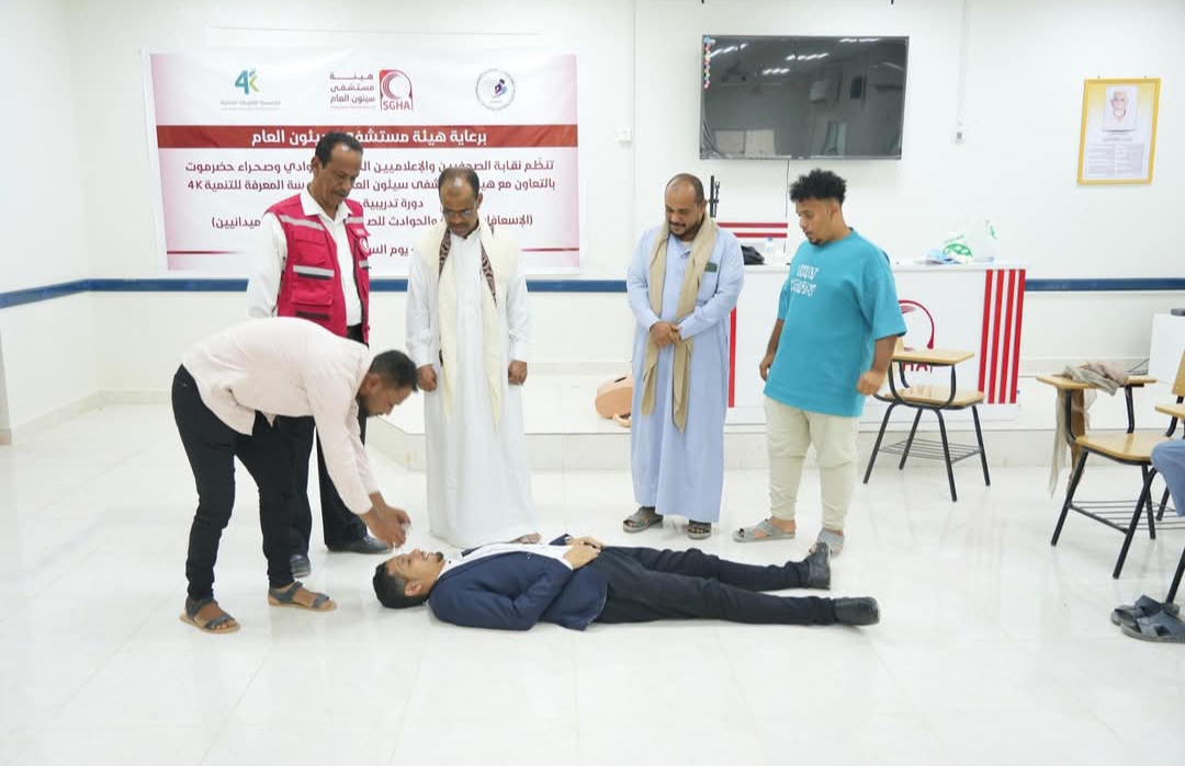 نظمت نقابة الصحفيين والإعلاميين الجنوبيين بوادي وصحراء حضرموت، بالتعاون مع هيئة مستشفى سيئون العام ومؤسسة المعرفة للتنمية 4K، دورة تدريبية في الإسعافات الأولية والحوادث للإعلاميين الميدانيين، بقاعة هيئة مستشفى سيئون العام.