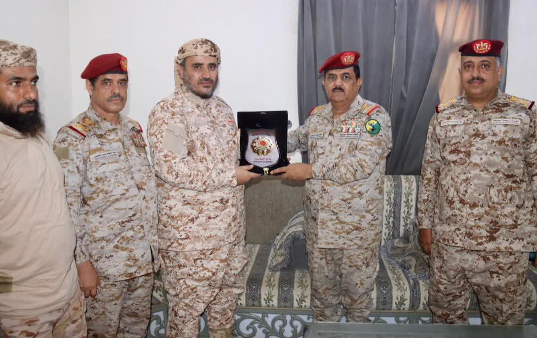 وتسلم درع الوزارة نائب قائد قوات العمالقة الجنوبية، العميد عبدالرحمن العمري، خلال الزيارة التفقدية، التي نفذها وزير الدفاع لمواقع قوات العمالقة الجنوبية، في جبهة الساحل الغربي.