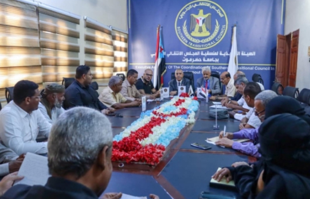 فريق التوجيه والرقابة الرئاسي يعقد اجتماعاً مشتركاً مع تنفيذية انتقالي حضرموت ومنسقية الجامعة بالمحافظة