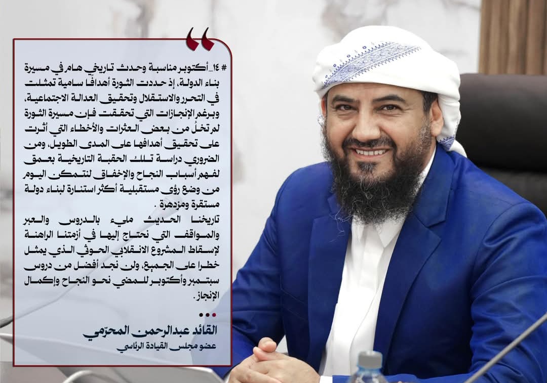 وفي منشور له على صفحته الرسمية على مواقع التواصل الاجتماعي، بمناسبة الذكرى الـ62 لثورة الـ14 من أكتوبر المجيدة، أشار القائد المحرّمي إلى أنه “برغم الإنجازات التي تحققت فإن مسيرة الثورة لم تخلُ من بعض العثرات والأخطاء التي أثرت على تحقيق أهدافها على المدى الطويل”.