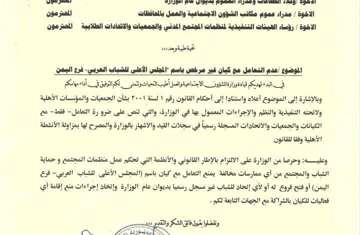 أصدرت وزارة الشؤون الاجتماعية والعمل تعميما رسميا، يحظر التعامل مع كيان غير مرخص يُعرف باسم “المجلس الأعلى للشباب العربي فرع اليمن”.