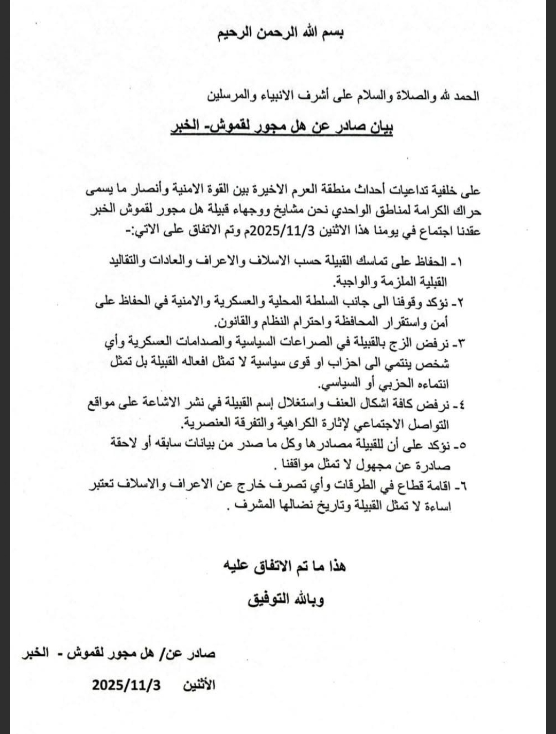 أصدرت قبيلة آل مجور لقموش” اليوم، بيانًا أكدوا فيه رفضهم التام لجميع أشكال الفوضى والعنف، وبيّنوا دعمهم الكامل للسلطة المحلية في محافظة شبوة، في جهودها للحفاظ على الأمن والاستقرار في المحافظة.