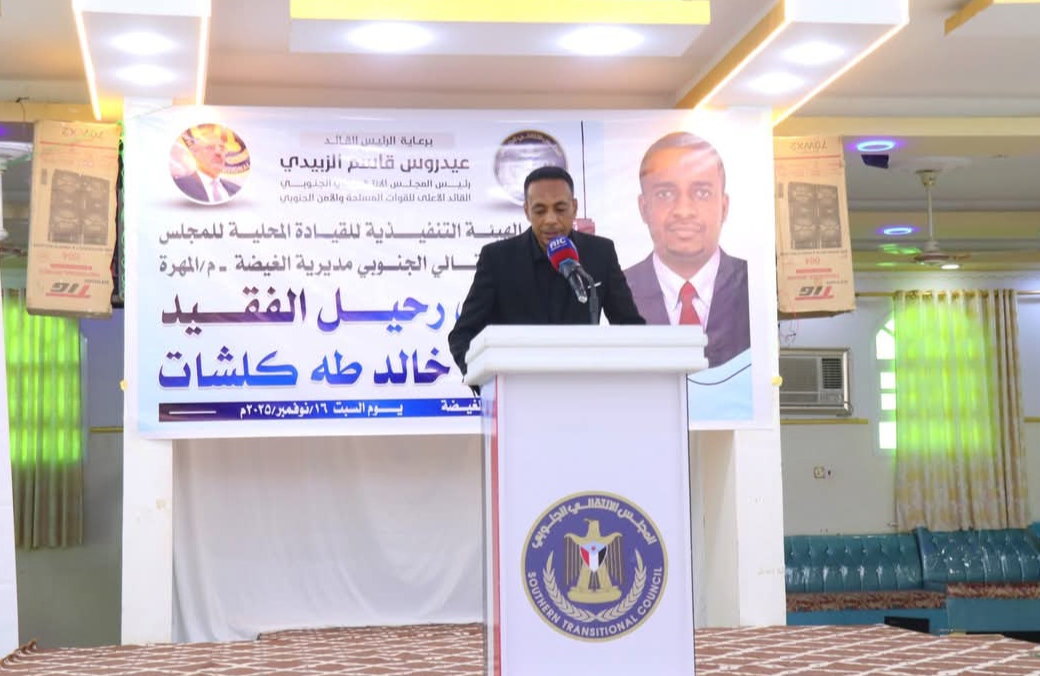 أحيت الهيئة التنفيذية للقيادة المحلية للمجلس الانتقالي الجنوبي بمديرية الغيضة، محافظة المهرة، اليوم، الذكرى الأولى لرحيل الفقيد خالد طه سعيد كلشات، وذلك بحضور الأستاذ عبدالرحيم الصادق، رئيس الهيئة التنفيذية للقيادة المحلية للمجلس الانتقالي الجنوبي بمحافظة المهرة، وعدد من القيادات المحلية والشخصيات الاجتماعية وأفراد أسرة الفقيد.