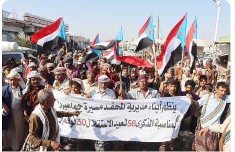 وأن هذا اليوم لم يكن مجرّد حدث عابر، بل كان تتويجاً لنضال بدأ بثورة14 اكتوبر والتي أنطلقت من جبال ردفان الشمّاء، وأستمرت أربعة أعوام من الكفاح المسلّح حتى نال شعبنا الجنوبي استقلاله الناجز في 1967م، وأن أحتفالات شعبنا الجنوبي اليوم بهذه الذكرى الخالدة على كل قلب جنوبي حر يسعى للحرية والإنعتاق، وهانحن نحتفل بالذكرى الثامنة والخمسون لعيد الاستقلال الوطني الثلاثين من نوفمبر المجيد وشعبنا الجنوبي يواجه تحديات كبيرة وهي حرب الخدمات، والتجويع،وتأخر المرتبات والتي اتخذها أعداء الوطن والإنسانية كوسيلة لعرقلة مسيرة نضالنا، وثبات مبادئنا عن تحقيق الهدف الأسمى لكل جنوبي حر شريف وهو إستعادة الدولة الجنوبية المختطفة من الاستعمار اليمني، وان هذه الأجندات لن تثني المؤمنين بالحرية والخلاص من الهيمنة المفروضة على شعبنا الجنوبي