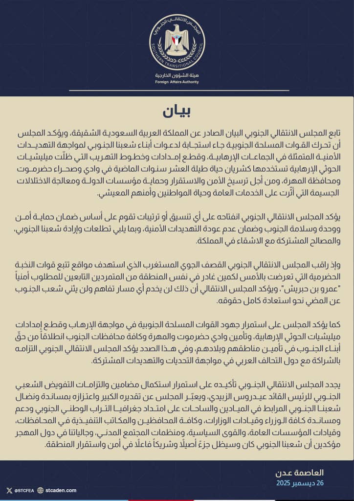 تابع المجلس الانتقالي الجنوبي البيان الصادر عن المملكة العربية السعودية الشقيقة، ويؤكد المجلس ان تحرك القوات المسلحة الجنوبية جاء استجابة لدعوات أبناء شعبنا الجنوبي لمواجهة التهديدات الأمنية المتمثلة في الجماعات الإرهابية، وقطع امدادات وخطوط التهريب التي ظلّت ميليشيات الحوثي الإرهابية تستخدمها كشريان حياة طيلة العشر سنوات الماضية في وادي وصحراء حضرموت ومحافظة المهرة، ومن أجل ترسيخ الأمن والاستقرار وحماية مؤسسات الدولة ومعالجة الاختلالات الجسيمة التي أثّرت على الخدمات العامة وحياة المواطنين وأمنهم المعيشي.
