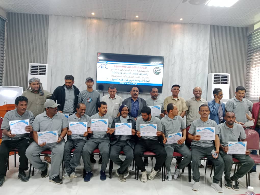 وأشار الأحمدي” إلى الأهمية الكبيرة للبرامج التدريبية والتأهيلية في تطوير الكوادر الفنية في مختلف الألعاب الرياضية، مشيداً بجهود الاتحاد العام لكرة القدم بقيادة الشيخ أحمد صالح العيسي، وأعضاء مجلس الإدارة، والمحاضر الدولي الآسيوي الكابتن محمود عبيد، إضافة إلى مكتب الشباب والرياضة وفرع الاتحاد بالمحافظة، لما قدموه من إسهام فاعل في إنجاح أول دورة تدريبية لمدربي محافظة شبوة على مستوى (C).