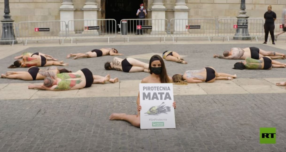 احتج عشرات الناشطين من منظمة Anima Naturalis غير الحكومية وهم شبه عراة أمام مجلس مدينة برشلونة، مطالبين باستخدام الألعاب النارية الصامتة أثناء الاحتفالات.