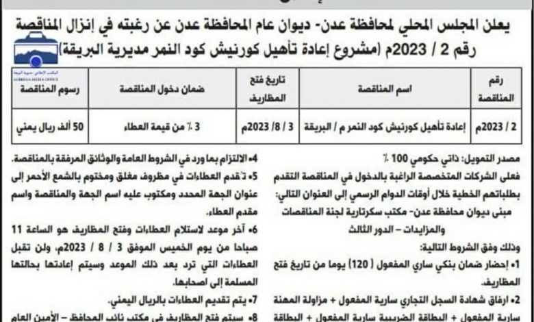 يعلن المجلس المحلي لمحافظة عدن – ديوان عام المحافظة عدن عن رغبته في إنزال المناقصة رقم 2 / 2023م، ( مشروع إعادة تأهيل كورنيش كود النمر – مديرية البريقة ) والذي سيتم بتمويل ذاتي حكومي 100%.