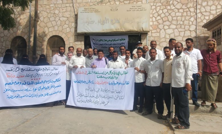 كوادر المركز الوطني لعلاج الاورام بالمكلا يلوحون برفع عصاء الاضراب الشامل وذلك بعد انتهاء مهلة تعليق الشارات الحمراء يوم الاثنين الماضي٢٠٢٣/٨/٧ ولم تتحقق المطالب المقدمة للادارة والتي رفعت بتاريخ ٢٠٢٣/٧/١١.. وأكدت لجنة طاقم المركز الوطني لعلاج الاورام قالت فيه: أن اللجنة المكلفة من قبل الطاقم قررت اعلان الاضراب الجزئي ابتداءً من يوم غداً الخميس ٢٠٢٣/٨/١٠ولمدة ٣ ايام متتالية وان لم تتم الاستجابة من قبل الادارة سننتقل مضطرين الى مرحلة الاضراب الشامل من يوم الثلاثاء الموافق ٢٠٢٣/٨/١٥