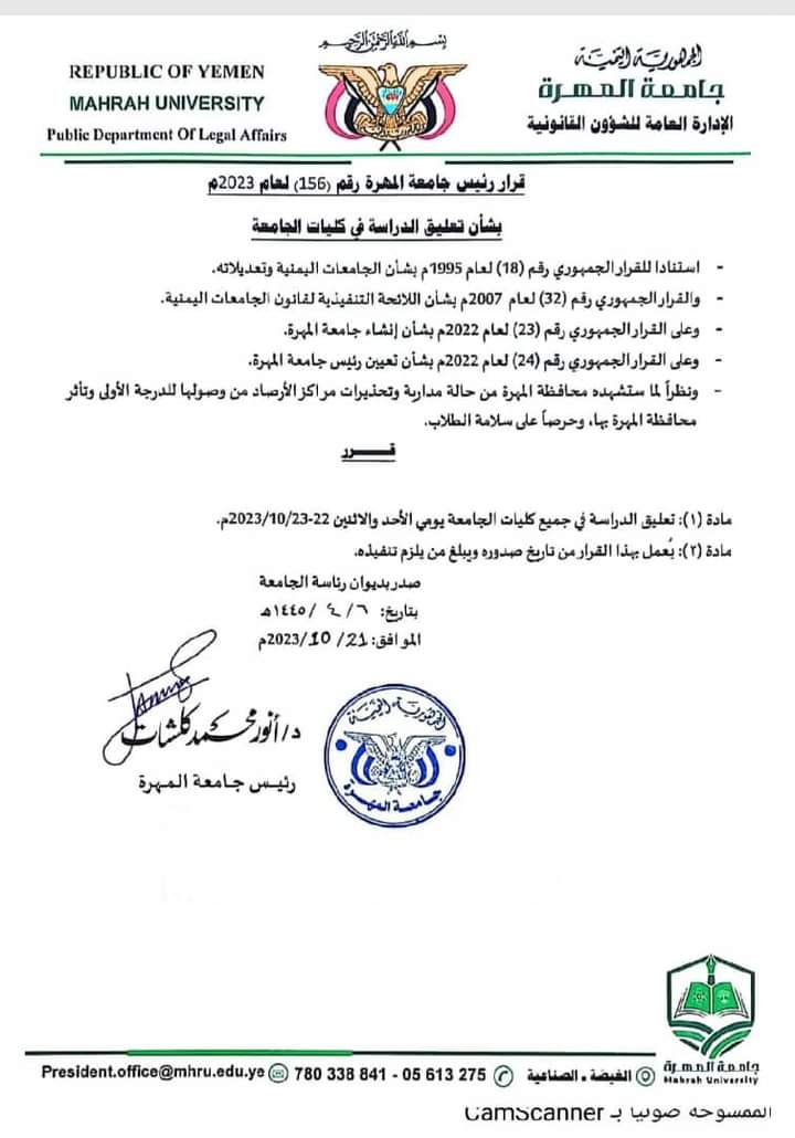 اصدر رئيس جامعة المهرة معالي الدكتور أنور محمد كلشات توجيهاته بتعليق العملية التعليمية في جميع كليات الجامعة ليومي الأحد والاثنين الموافق 22-23 /10 /2023م تحسباً للحالة المدارية “تيج” المتوقع وصولها خلال الساعات القليلة القادمة.