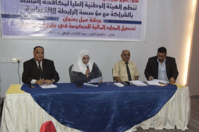 نظمت الهيئة الوطنية العليا لمكافحة الفساد بالشراكة مع مؤسسة الرابطة الاقتصادية، اليوم، بالعاصمة عدن، ورشة عمل حول تحصيل الموارد المالية للحكومة في ظروف الحرب.