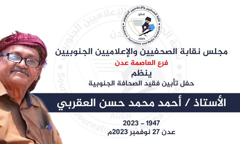 تنظم نقابة الصحفيين والإعلاميين الجنوبيين فرع العاصمة عدن، غدا الأثنين، فعالية تأبين فقيد الصحافة الجنوبية الفارس الصحفي البارز “أحمد محمد حسن العقربي”