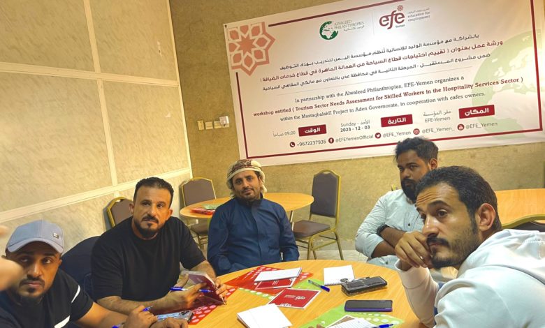 بالشراكة مع مؤسسة الوليد للإنسانية نظمت مؤسسة اليمن للتدريب بهدف التوظيف في عدن ورشة عمل حول “تقييم احتياجات قطاع السياحة من العمالة الماهرة في خدمات الضيافة و الفندقة” ضمن المرحلة الثانية من مشروع مستقبلك بالتعاون مع أصحاب المقاهي السياحية. والتي تعتبر خطوة هامة نحو تطوير قطاع السياحة في اليمن وخلق فرص عمل للشباب.