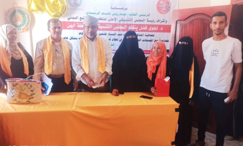 دشن المجلس التنسيقي الأعلى لمنظمات المجتمع المدني بمحافظة أبين اليوم الأربعاء بمبنى المجلس التنسيقي بمدينة زنجبار محاضراته التوعوية المناهضة للعنف ضد النساء ضمن حملة الـ 16 يوم وتضامنا مع المعنفات الفلسطينيات ونساء العالم بشكل عام، بحضور مديرة الشؤون الاجتماعية بانتقالي المحافظة الأستاذة جيهان حيدرة ، ومديرة إدارة المرأة والطفل الأستاذة وجدان ماسك ، ورئيس تنفيذية انتقالي زنجبار الاستاذ محمد سعيد المرقشي.