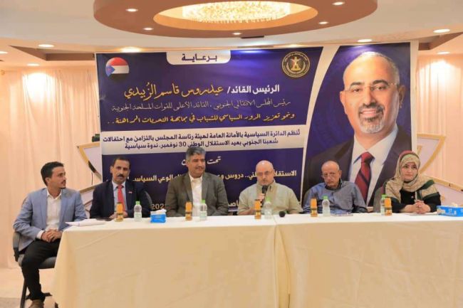 نظمت الدائرة السياسية في الأمانة العامة لهيئة رئاسة المجلس الانتقالي الجنوبي، تزامناً مع احتفالات شعبنا الجنوبي بعيد الاستقلال الوطني 30 نوفمبر ندوة سياسية ،اليوم الخميس في العاصمة عدن، تحت عنوان”الاستقلال الوطني.. دروس وعبر في تجربة بناء الوعي السياسي للشباب“، برعاية كريمة من الرئيس القائد عيدروس بن قاسم الزُبيدي، رئيس المجلس الانتقالي الجنوبي، نائب رئيس مجلس القيادة الرئاسي.