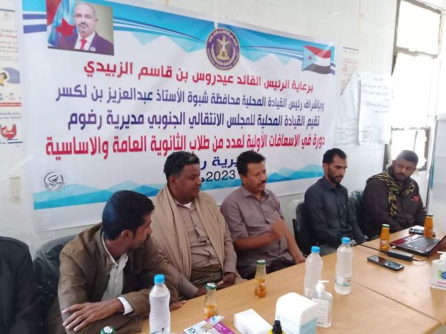 برعاية الرئيس القائد عيدروس قاسم الزُبيدي رئيس المجلس الانتقالي الجنوبي نائب رئيس مجلس القيادة الرئاسي، وإشراف رئيس القيادة المحلية للمجلس الانتقالي بالمحافظة الأستاذ عبدالعزيز بن لكسر ، نظمت إدارة الشباب والطلاب بانتقالي مديرية رضوم بمحافظة شبوة وبالتنسيق مع مكتب الصحة بالمديرية صباح اليوم السبت بمستشفى رضوم دورة تدريبية حول الإسعافات الأولية لعدد 30 متدرباً من طلاب المدارس .
