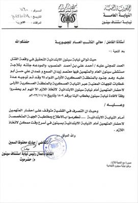 يأتي ذلك بعد توجية مذكرة من نيابة استئناف سيئون انه تم التوجيه عدة خطابات عبر النيابة العسكرية بالمنطقة لاحضار المتهمين بالقتل العمد على المجني عليه احمد علي بن علي المنصوب المودعة جثته ثلاجة مستشفى سيئون والمتهمين فيها معتصم زيدان الصمع وغمدان علي حسن وهم جنود بالمنطقة العسكرية الأولى.