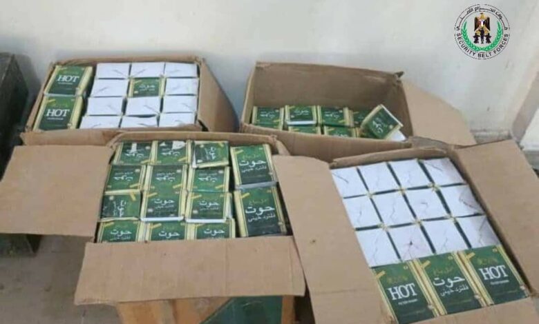 حزام عدن يلقي القبض على مطلوب أمني ويضبط كمية من مادة (شمة الحوت) منتهية الصلاحية
