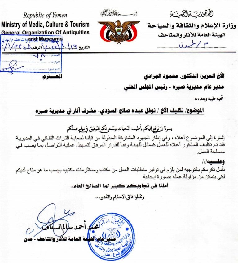 في إطار الجهود المشتركة المبذولة من قبلنا لحماية التراث الثقافي في المديرية فقد تم تكليف الأستاذ نوفل عبده صالح السودي للعمل كممثل للهيئة وفقا للقرار المرفق لتسهيل عملية التواصل بما يصب في مصلحة العمل”.