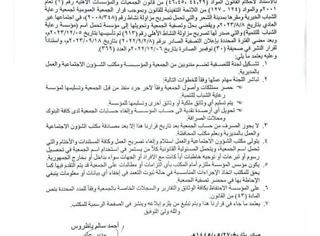 أصدر مكتب وزارة الشؤون الاجتماعية والعمل بمحافظة حضرموت قرارا بحل و تصفيه نشاط جمعية رعاية الشباب الاجتماعية الخيرية بمديرية الشحر إلى نظام مؤسسة تحت مسمى ( مؤسسة رعاية الشباب للتنمية) بقرار وزاري رقم ( 913 ) للعام 2023 م .