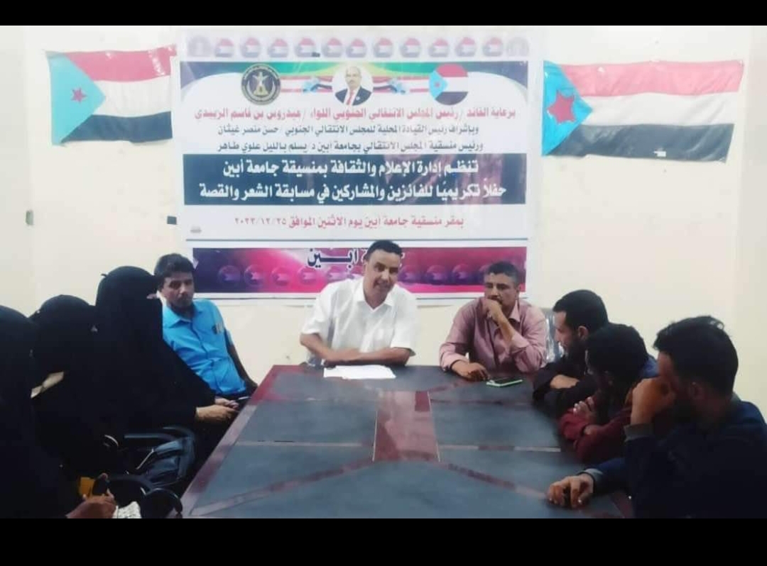 نظمت إدارة الإعلام والثقافة بمنسقية المجلس الانتقالي الجنوبي بجامعة أبين، اليوم الاثنين، حفلاً تكريمياً لطلاب الجامعة المشاركين في مسابقة الشعر والقصة، التي استمرت لمدة شهرًا كاملًا.