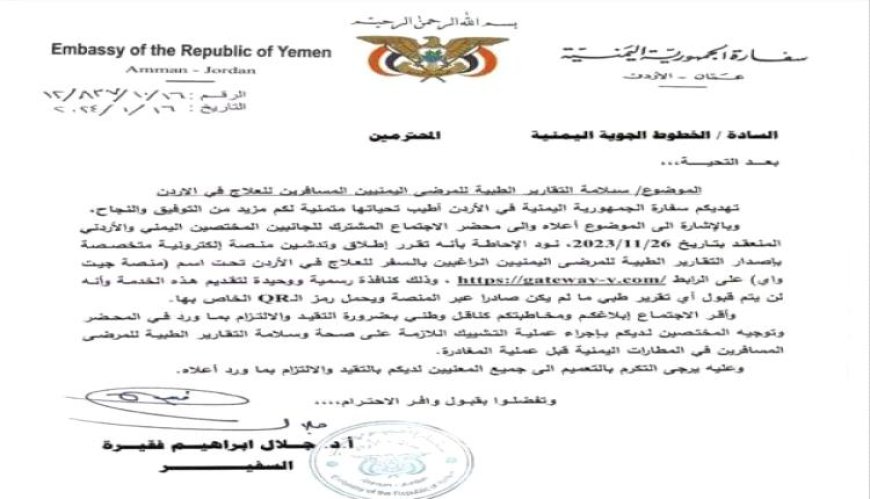 وطلبت السفارة أيضًا من الخطوط الجوية اليمنية التقيد بتوجيهات محضر الاجتماع المشترك بين الجانبين وإجراء التحقق من صحة التقارير الطبية للمرضى في المطارات اليمنية قبل المغادرة.