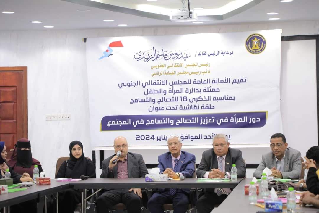 نظمت دائرة المرأة والطفل في الأمانة العامة لهيئة رئاسة المجلس الانتقالي الجنوبي، اليوم الأحد بالعاصمة عدن، حلقة نقاشية تحت عنوان “دور المرأة في تعزيز التصالح والتسامح في المجتمع”.