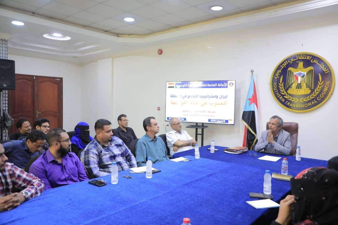 نظمت الأمانة العامة لهيئة رئاسة المجلس الانتقالي الجنوبي، اليوم الثلاثاء، في مقرها بالعاصمة عدن، محاضرة توعوية بعنوان” إيران واستراتيجية التوسع في المنطقة… الجنوب في خط المواجهة”.