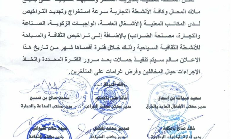 أعلنت السلطة المحلية بمديرية الشحر ومكاتبها التنفيذية لجميع ملاك المحال وكافة الأنشطة التجارية سرعة استخراج وتجديد التراخيص لدى المكاتب المعنية ( الأشغال العامة ، الواجبات الزكوية ، الصناعة والتجارة ، مصلحة الضرائب ) بالإضافة إلى تراخيص الثقافة والسياحة للأنشطة السياحية وذلك خلال فترة أقصاها شهر من تاريخ هذا الإعلان 2024/2/8 م ما لم سيتم تنفيذ حملات بعد مرور الفترة المحددة واتخاذ الإجراءات حيال المخالفين وفرض غرامات على المتأخرين .