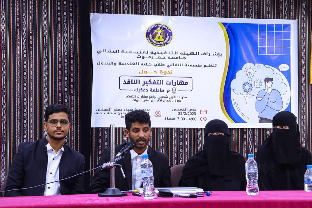 منسقية الانتقالي بكلية الهندسة والبترول بجامعة حضرموت تنظم ندوة علمية في مهارات التفكير الناقد