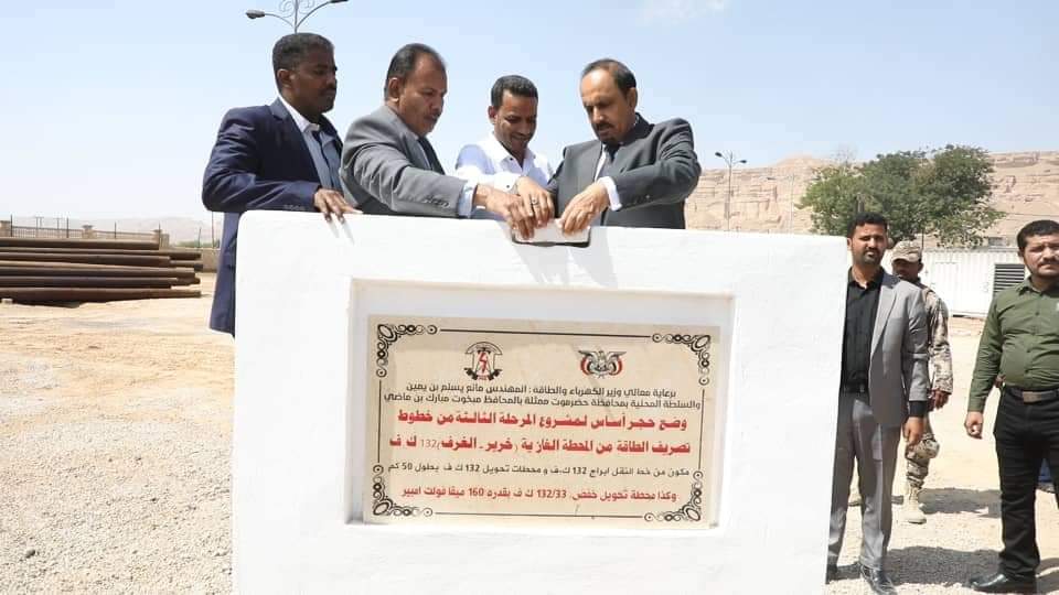 وضع محافظ حضرموت الأستاذ مبخوت بن مبارك بن ماضي، ومعه وكيل المحافظة لشؤون مديريات الوادي والصحراء الاستاذ عامر سعيد العامري، اليوم بمنطقة “الغرف” بمديرية تريم حجر الأساس لمشروع أبراج نقل وتصريف الطاقة من المحطة الغازية (خرير -الغرف) 132 ك.ف بطول 50 كيلومتر ومحطة تحويل خفض 132/33ك.ف بقدرة (160) ميقا فولت امبير بتمويل من السلطة المحلية بالمحافظة.
