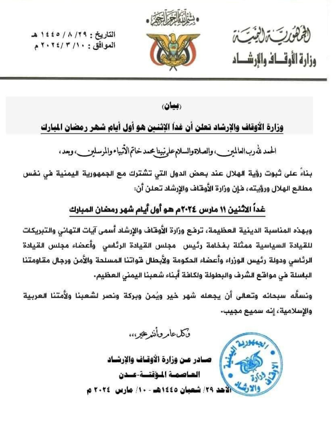 وقالت الوزارة في بيان لها:” أن غداً الاثنين الموافق الحادي عشر من شهر مارس لعام ألفين وأربعةٍ وعشرين للميلاد هو أول أيام شهر رمضان المبارك، بناءً على ثبوت رؤية الهلال عند بعض الدول التي تشترك مع الجمهورية اليمنية في نفس مطالع الهلال ورؤيته”.