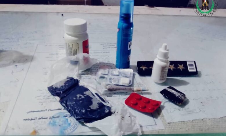 وأوضحت عمليات الحزام الأمني لحج أن جنود نقطة الحسيني وأثناء التفتيش الروتيني اشتبهوا بشخصين كانا على متن باص فوكسي حيث عثر بحوزتهما على كمية من مادة الحشيش و بخاخ مخدر بعد إخضاعهما لعملية تفتيش دقيق.