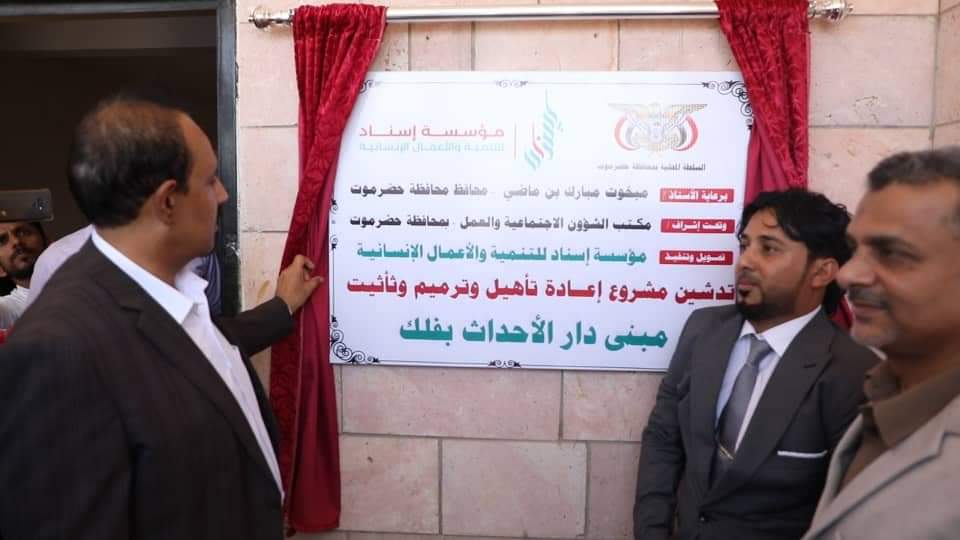 دشن محافظ حضرموت الأستاذ مبخوت مبارك بن ماضي، اليوم استلام مبنى دار الأحداث بمنطقة فلك بعد إعادة تأهيله وترميمه وتأثيثه.