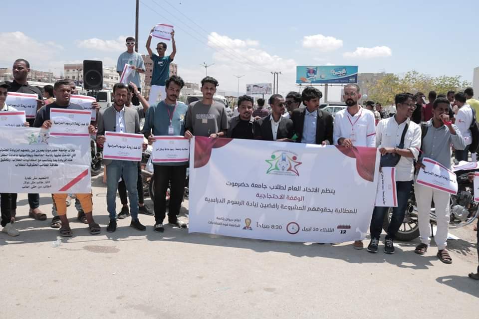 نظم الإتحاد العام لطلاب جامعة حضرموت، وقفة احتجاجية لطلاب الجامعة، للتعبير عن رفضهم للقرارات المجحفة حول زيادة الرسوم الدراسية، ومطالبين بتحسين جودة الخدمات الطلابية، وفتح تحقيق في السرقات المتكررة للسكنات الجامعية ووضح حدًا لها.