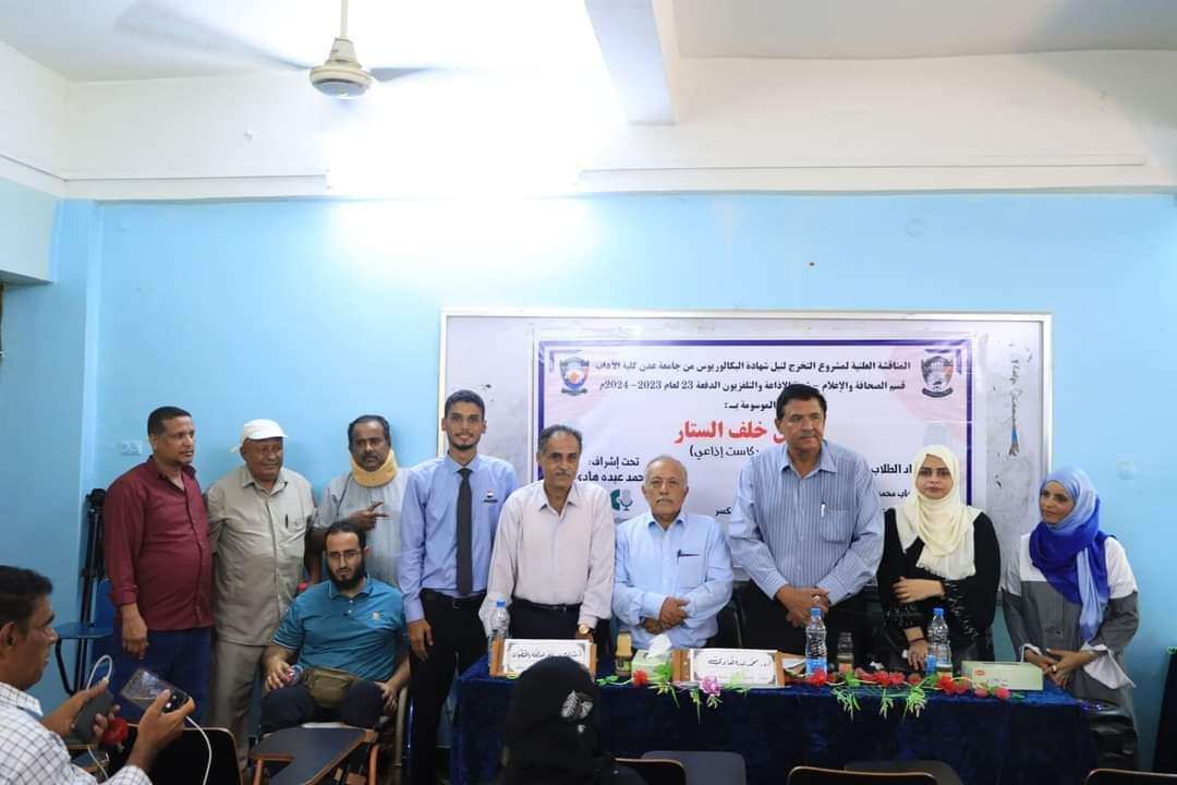 بكلية الإعلام جامعة عدن، مناقشة مشروع تخرج طلاب قسم الإذاعة والتلفزيون بكلية الاعلام، والذي تضمن إعداد برنامج إذاعي بعنوان: (ابطال خلف الستار)