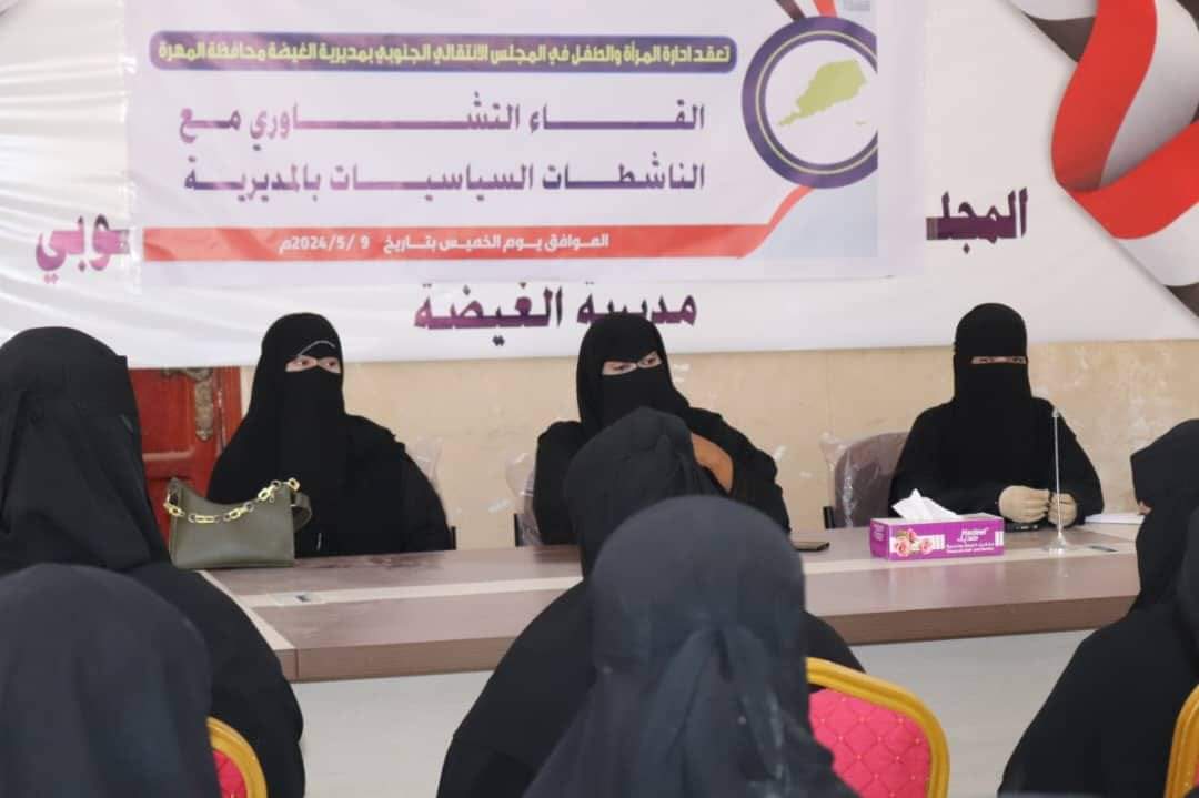 نفذ قسم المرأه والطفل بالهيئه التنفيذية بانتقالي مديرية الغيضة صباح امس الخميس ، لقاء تشاوري مع عده من الناشطات بالمديرية تم من خلالة مناقشة العديد من القضايا المتعلقة بالمرأة في محافظة عام و المديرية بشكل خاص .